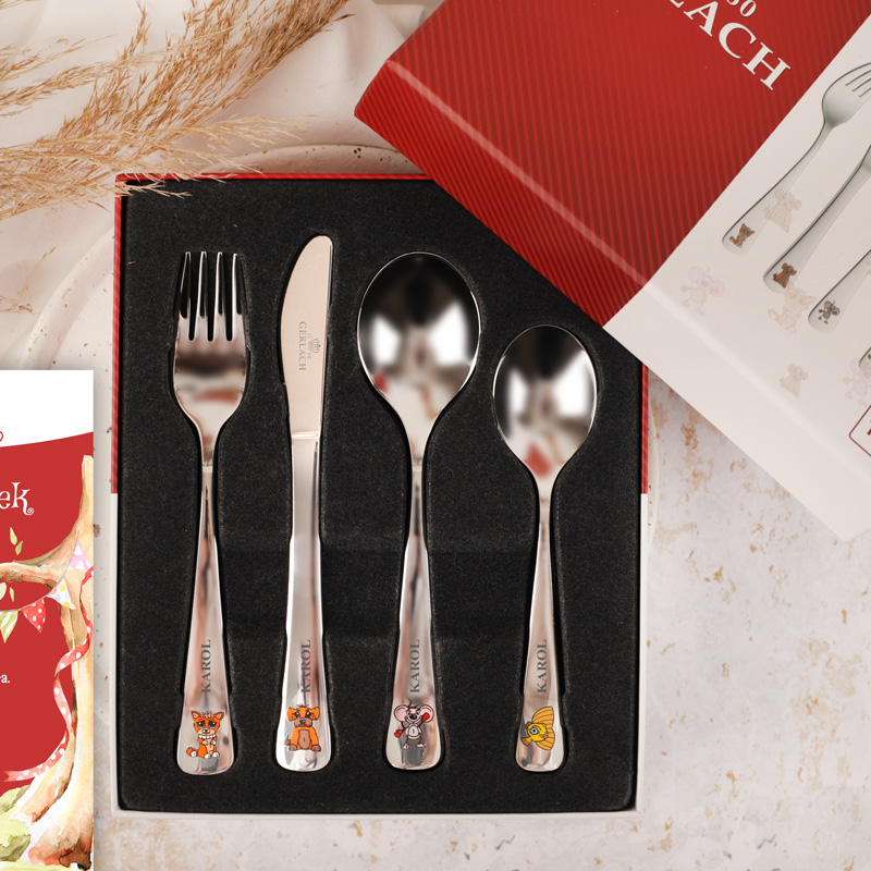 Zestaw sztućców Gerlach dla dzieci z grawerem imienia to unikalny prezent na pierwsze urodziny, który łączy codzienną użyteczność z sentymentalnym charakterem.