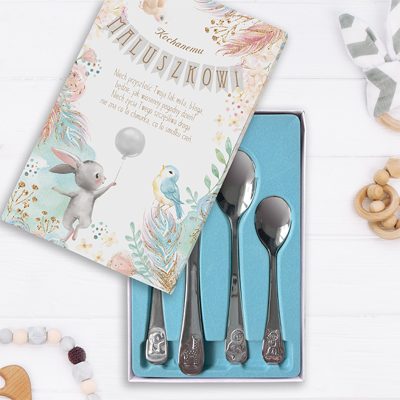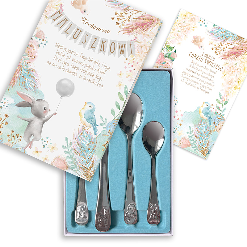 Sztućce zdobione są dziecięcymi motywami zwierzątek, co nadaje im wyjątkowego charakteru i sprawia, że wyróżniają się spośród tradycyjnych upominków. Eleganckie pudełko sprawia, że całość prezentuje się bardzo szykownie i od razu gotowa jest do wręczenia. Do zestawu dołączono także kartkę z uroczymi życzeniami: