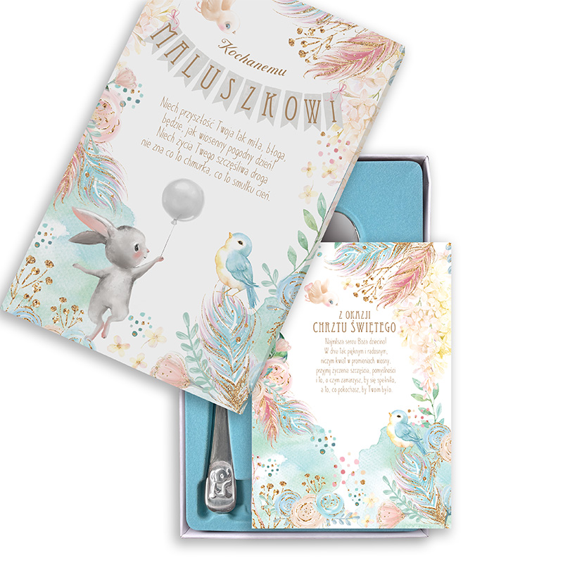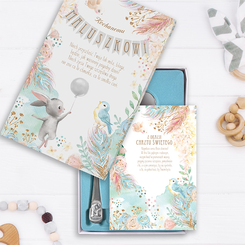 Sztućce dziecięce w ozdobnym pudełku to wyjątkowy podarunek na Chrzest Święty – praktyczny, a jednocześnie pełen emocji i symboliki. To prezent, który łączy piękną formę z głębokim przekazem. Front pudełka zdobi pastelowa ilustracja z króliczkiem i balonikiem oraz dedykacja: