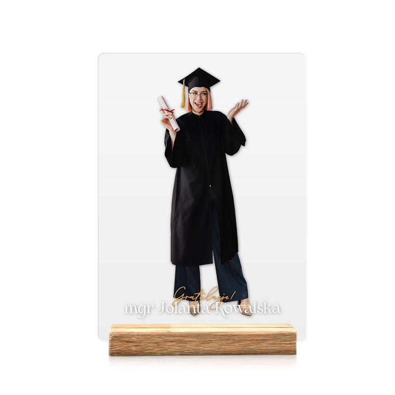 Tabliczka akrylowa ze zdjęciem to nowoczesny prezent na zakończenie studiów, który łączy w sobie personalizację i elegancki wygląd. Wykonana z przezroczystego szkła akrylowego i osadzona na drewnianej podstawce, stanowi ciekawy element dekoracyjny, który można postawić na półce, biurku czy w domowym wnętrzu. Personalizacja obejmuje zdjęcie absolwentki oraz imię i nazwisko wraz z tytułem magistra. Na tabliczce znajduje się sylwetka w todze i birecie, a twarz zostaje zastąpiona twarzą z przesłanego zdjęcia. Dzięki temu całość w pełni oddaje charakter personalizacji. Uzupełnieniem projektu jest imię i nazwisko oraz napis gratulacyjny, który podkreśla okazję i sprawia, że tabliczka staje się indywidualnym prezentem na zakończenie studiów.