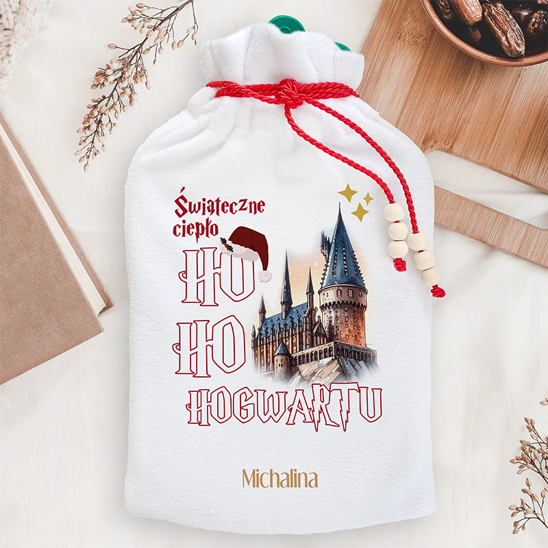 Termofor został zamknięty w miękkim, białym pokrowcu. Z przodu znajduje się trwały nadruk w stylu nawiązującym do magicznego świata – zamek niczym z Hogwartu, czapka Mikołaja i świąteczne akcenty graficzne. Napis wykonano czcionką inspirowaną serią o młodym czarodzieju. Całość uzupełnia personalizacja – imię nadrukowane w dolnej części. W górnej części pokrowca umieszczono czerwony sznurek z ozdobnymi drewnianymi koralikami, który służy do wiązania. Sam termofor wewnątrz wykonano z odpornego tworzywa – dobrze utrzymuje temperaturę i sprawdza się zarówno do rozgrzewania, jak i łagodzenia bólu. Termofor jest lekki, poręczny i gotowy do użycia zaraz po napełnieniu gorącą wodą.