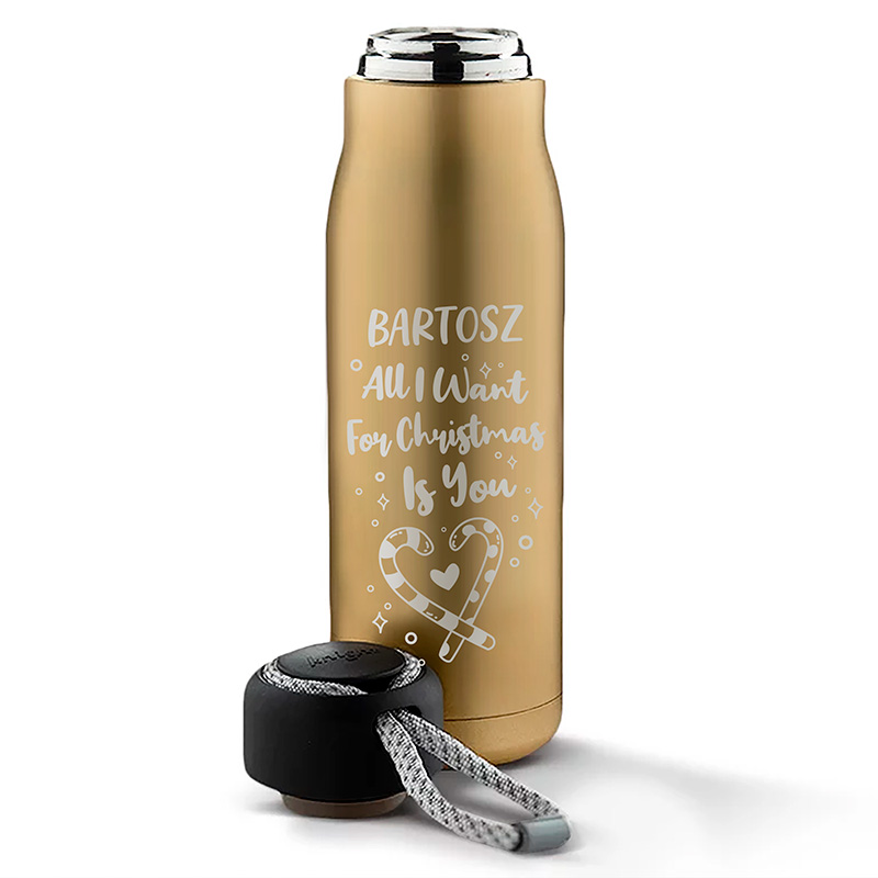 Personalizowany, ze stali nierdzewnej termos, który posiada wygodny korek, do odkręcania na sznurku. Po odkręceniu zakrętki można ją na moment picia, zawiesić na nadgarstku. Butelka posiada dwie ścianki, które tworzą warstwę izolacyjną, dzięki temu ciepłota napoju, w termosie utrzyma się o wiele dłużej. Termos zatem można w szczególności używać na zewnątrz, gdy jest zimno, a łyk ciepłej herbatki jest na wagę złota. Metalowa obudowa ma matowy, złoty odcień, na którym zostanie wykonana świąteczna, miłosna dedykacja, którą można skierować do ukochanej osoby. Napis oczywiście wzbogaci imię oraz dwa lizaki w kształcie cukrowej laski. Kultowe słowa ze świątecznej, znanej na całym świecie piosenki, zajęły miejsce na wypełnionym gorącem termosem: All I want for Christmas is You! Ech…. czego chcieć więcej. Te słowa w tłumaczeniu na nasze to nic innego, jak wyznanie miłości.