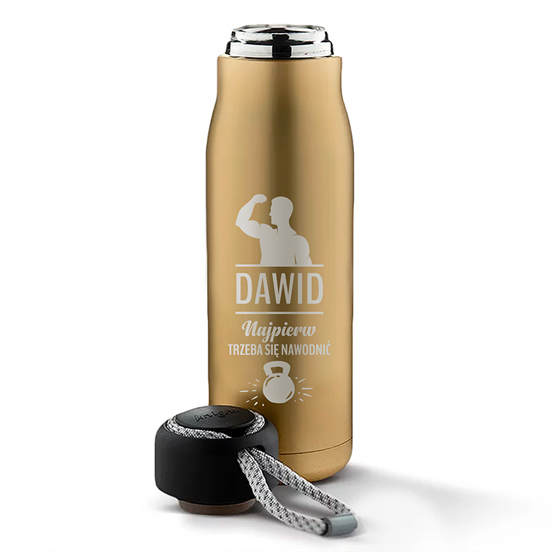 • Termos / prezent dla sportowca ozdobiony jest napisem: „Najpierw trzeba się nawodnić”, a także grafiką mężczyzny prezentującego swój biceps. Na termosie umieścimy też imię mężczyzny, którego chcecie obdarować. Design dopełni grafika z ciężarkiem. Grawer na termosie będzie miał metaliczny, srebrny kolor, z kolei sam termos na napoje z personalizacją jest złoty i ma matową strukturę.