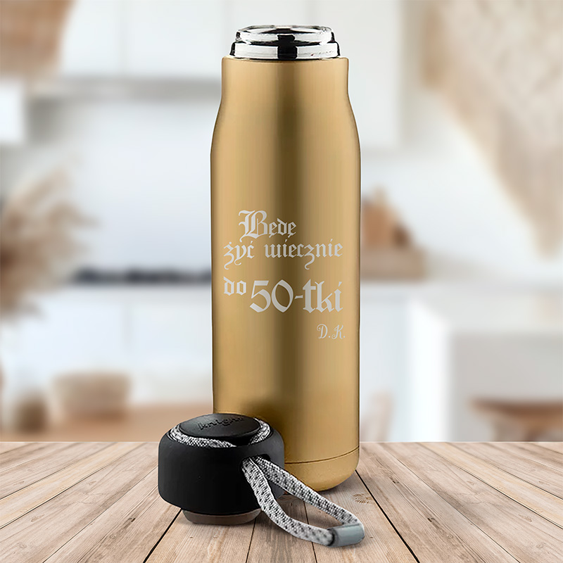 Korpus wykonano ze stali nierdzewnej, a podwójne ścianki utrzymują ciepło lub chłód napoju przez wiele godzin. Dzięki temu ulubiona kawa, herbata czy napar smakują doskonale także podczas podróży. Powierzchnia termosu została ozdobiona grawerem, co nadaje całości elegancji i trwałości. Centralnym elementem jest napis „Będę żyć wiecznie do 50-tki”, a obok cytatu umieszczane są inicjały jubilata. To sprawia, że termos staje się w pełni personalizowanym prezentem. Matowe złote wykończenie wygląda stylowo, a czarna nakrętka ze sznurkiem ułatwia przenoszenie.