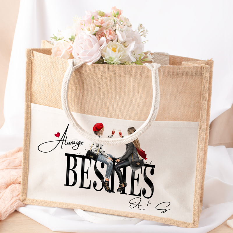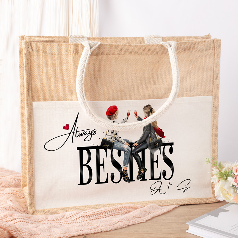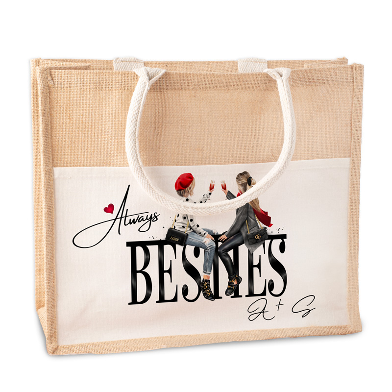 Torba lniana shopperka to wygodna i pojemna torba na ramię, wykonana z wysokiej jakości produktów, które zapewnią trwałość i estetyczny wygląd. Jej naturalny, jasny kolor idealnie komponuje się z personalizowaną grafiką, przedstawiającą dwie przyjaciółki w modnych stylizacjach, wznoszące toast kieliszkami wina, co symbolizuje radość z bycia razem. Napis Always BESTIES dodaje całości wyjątkowego charakteru i podkreśla więź między przyjaciółkami. Torba jest wyposażona w mocne, szerokie uchwyty z lnu, które zapewniają wygodę noszenia nawet przy większym obciążeniu. W przestronnej komorze głównej zmieści się wszystko, co potrzebne – od książek, przez laptopa, po zakupy. Dodatkowo personalizacja inicjałami dodaje torbie osobistego akcentu, sprawiając, że staje się ona niepowtarzalna.