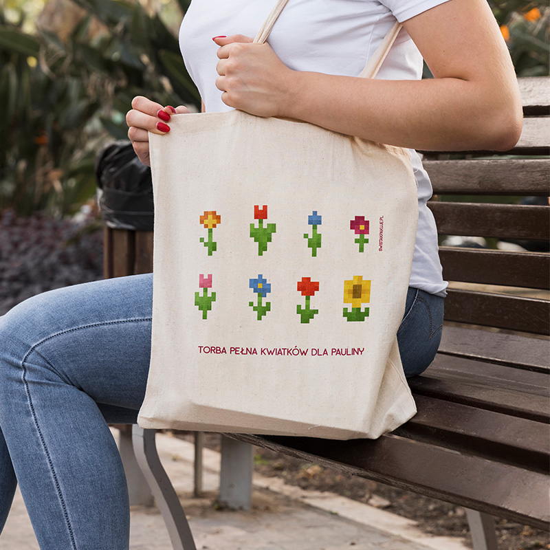 Całość dopełnia personalizowany napis „Torba pełna kwiatków dla [IMIĘ]”, dzięki czemu każda torba staje się jedyna w swoim rodzaju i dopasowana do właścicielki. Długie, solidne uchwyty zapewniają wygodę noszenia, nawet gdy torba jest wypełniona po brzegi. To ekologiczna i stylowa alternatywa dla plastikowych toreb, którą można wykorzystać na wiele sposobów – na zakupy, do szkoły, na uczelnię czy na spacer.