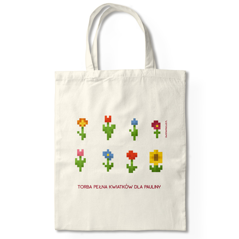 Torba na zakupy w kolorze białym z grafiką przedstawiającą osiem pikselowych kwiatów w różnych kolorach, umieszczonych w dwóch rzędach, oraz napisem 'TORBA PEŁNA KWIATKÓW DLA PAULINY' w czerwonym kolorze na dole.