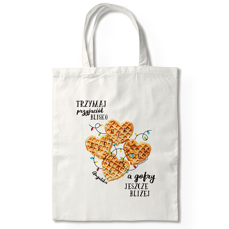 Na bawełnianej torbie znajduje się zabawna grafika przedstawiająca cztery gofry w kształcie serc – ulubiony przysmak Jedenastki – ozdobione kolorowymi lampkami, które jednoznacznie kojarzą się ze światem upside down. Całość uzupełnia hasło: „Trzymaj przyjaciół blisko, a gofry jeszcze bliżej”. Personalizacja imieniem nadaje torbie osobisty charakter i sprawia, że będzie jeszcze bardziej wyjątkowa. Torba wykonana jest z wysokiej jakości, wytrzymałego materiału. Bez problemu pomieści zeszyty, laptop, zakupy czy strój na trening. Długie uchwyty umożliwiają wygodne noszenie torby na ramieniu, a neutralny, jasny kolor świetnie komponuje się z każdą stylizacją.