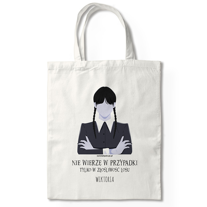 Torba Wednesday z napisem „Nie wierzę w przypadki” wykonana jest z wytrzymałej bawełny. Materiał jest lekki, a jednocześnie odporny na codzienne użytkowanie. Długie uchwyty pozwalają wygodnie nosić torbę na ramieniu lub w dłoni. Na przodzie znajduje się nadruk inspirowany kultową postacią o splecionych warkoczach i poważnym wyrazie twarzy. Obok grafiki widnieje cytat „Nie wierzę w przypadki, tylko w złośliwość losu”, a pod nim personalizowane imię, które nadaje torbie indywidualny charakter. W związku z tym każdy egzemplarz jest niepowtarzalny. Bawełniana tkanina jest przyjemna w dotyku i łatwa do utrzymania w czystości. Co więcej, torba jest pojemna i zmieści zeszyty, książki, zakupy albo drobiazgi potrzebne w ciągu dnia.