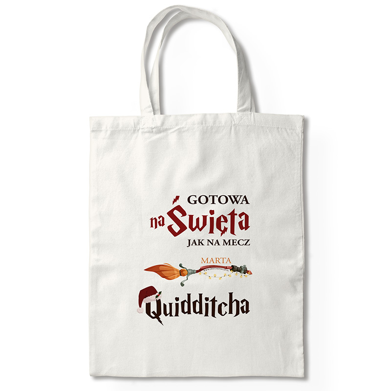 Gdy magia Świąt spotyka się z czarodziejskim światem znanym każdemu fanowi Hogwartu, powstaje coś naprawdę wyjątkowego. Personalizowana torba materiałowa z napisem „Gotowa na Święta jak na mecz Quidditcha” to oryginalny prezent dla każdej fanki Harry’ego Pottera. Torba została wykonana z bawełnianej tkaniny. Dzięki długim uszom wygodnie założysz ją na ramię, a duża pojemność pozwoli pomieścić wszystkie świąteczne zakupy, książki czy inne codzienne drobiazgi. Na froncie torby znajduje się oryginalna grafika z napisem w stylizowanym kroju pisma, który przywodzi na myśl uwielbianą serię książek i filmów. Całości dopełnia grafika miotły ozdobionej lampkami świątecznymi oraz imię właścicielki torby.