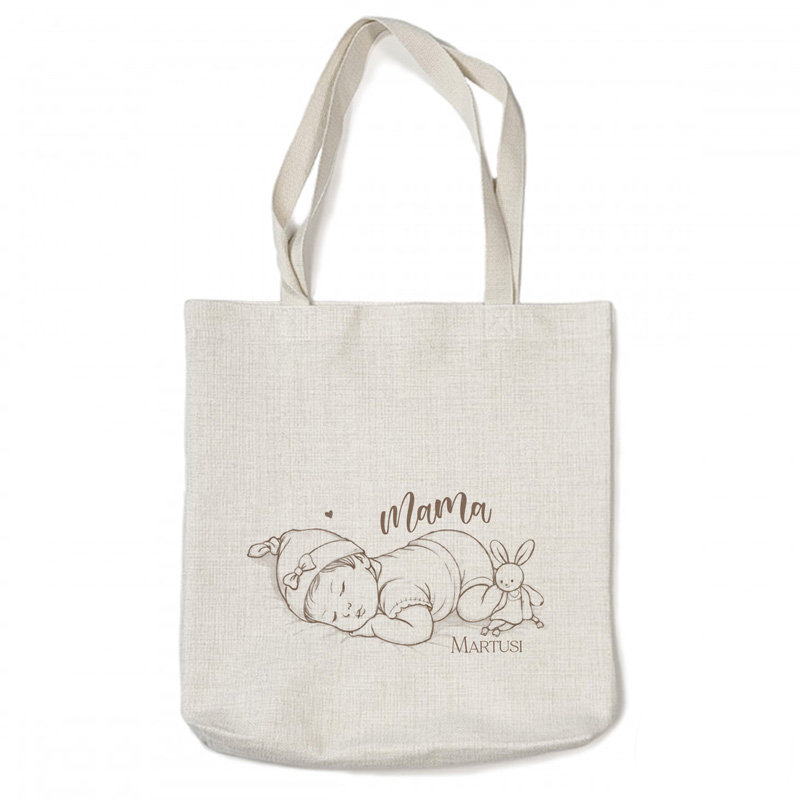 Torba wykonana jest z jasnego materiału z płócienną strukturą. Neutralny, beżowy odcień sprawia, że torba pasuje do codziennych stylizacji i świetnie komponuje się zarówno z casualowym, jak i bardziej eleganckim ubiorem. Długie, solidne uchwyty umożliwiają wygodne noszenie torby na ramieniu. Centralnym elementem projektu jest delikatna grafika przedstawiająca śpiącego maluszka. Nad ilustracją znajduje się napis „Mama”, a poniżej – personalizowane imię dziecka. To właśnie personalizacja sprawia, że torba staje się wyjątkową pamiątką pierwszych chwil macierzyństwa.