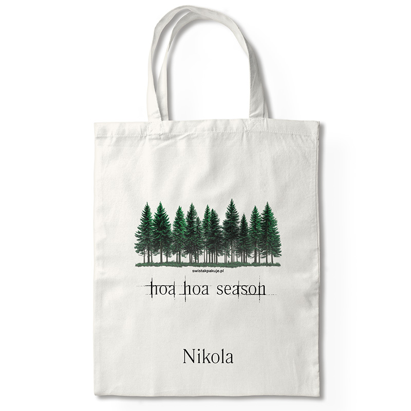 Torba Hoa Hoa Season to idealny prezent dla jesieniary i fanki sagi Zmierzch. Wykonana z trwałej, ekologicznej bawełny, ozdobiona grafiką zielonych drzew i napisem „hoa hoa season”, łączy styl z praktycznością. Personalizowany nadruk z imieniem nadaje jej wyjątkowego charakteru, a pojemny krój sprawia, że świetnie sprawdzi się na co dzień.