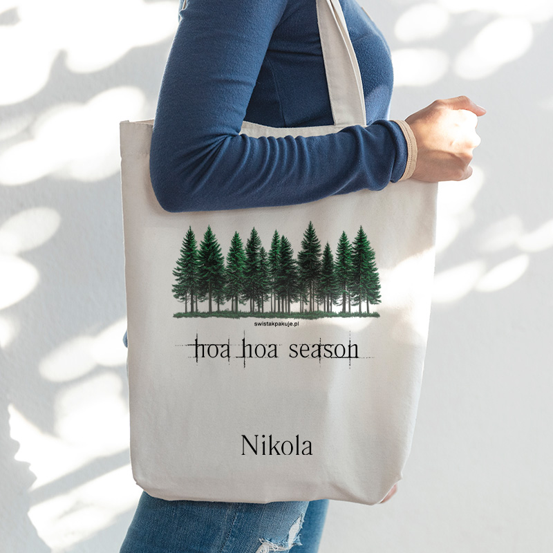 Torba Hoa Hoa Season to idealny prezent dla każdej jesieniary i miłośniczki spokojnych spacerów wśród drzew. Nawiązuje do klimatu natury, lasu i chłodnych, przytulnych dni z kubkiem kawy w dłoni. Subtelna grafika z motywem sosen oraz napis „hoa hoa season” tworzą niepowtarzalny design, który doskonale oddaje jesienny nastrój. Dzięki możliwości dodania imienia torba staje się jeszcze bardziej osobista i wyjątkowa.