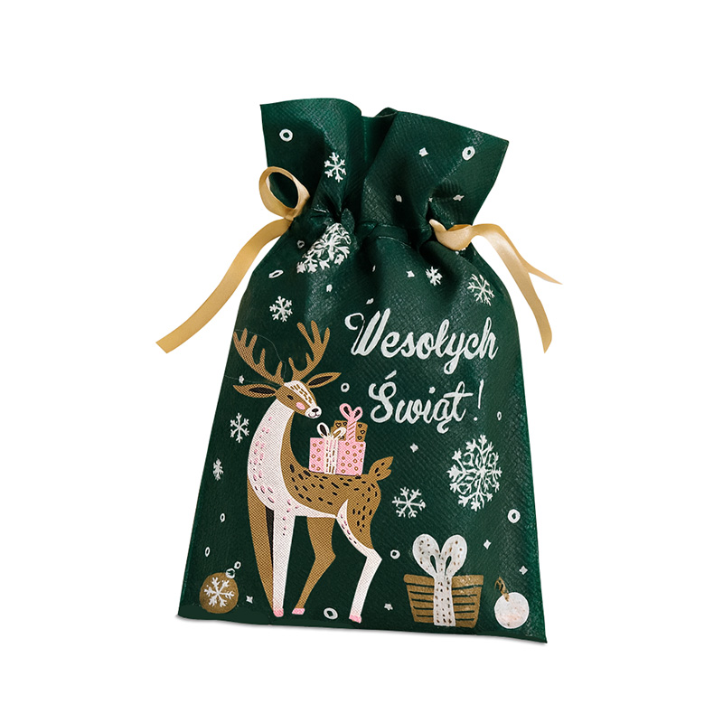 Zielony worek świąteczny z nadrukiem renifera i napisem „Wesołych Świąt” to eleganckie opakowanie na prezent. Dzięki złotej tasiemce łatwo się zamyka i dobrze trzyma formę. Doskonały do pakowania upominków dla dzieci, dorosłych i do paczek firmowych. Stylowy, wielokrotnego użytku i idealny na Boże Narodzenie. Sprawdź praktyczny sposób na szybkie pakowanie.