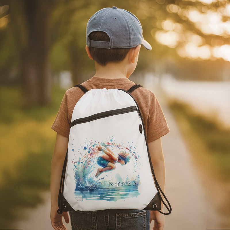 Efektowna grafika z pływakiem w ruchu przyciąga wzrok i dodaje sportowego charakteru. Personalizacja imieniem sprawia, że worek jest nie tylko praktyczny, ale też osobisty. Każdy chłopiec z dumą zabierze go na trening, zawody czy szkolną lekcję WF-u. Worek wykonano z lekkiego, ale wytrzymałego materiału, który świetnie sprawdza się w wilgotnym środowisku. Bez problemu pomieści ręcznik, kąpielówki, czepek i klapki. Dodatkowa kieszonka na zamek idealnie nadaje się na drobiazgi – jak klucze, żel pod prysznic czy okularki. Worek na Basen Dla Pływaka Prezent Dla Chłopca jest łatwy do czyszczenia – można go przetrzeć ściereczką lub wyprać w pralce.