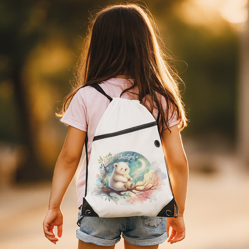 Worek na buty z obrazkiem niedźwiadka to wyjątkowy plecak, który wniesie odrobinę bajkowej atmosfery do codziennych obowiązków. Funkcjonalność i komfort połączone z fantazyjnym wzornictwem sprawiają, że to dodatek, który będzie towarzyszył dziecku każdego dnia – od przedszkola po domowe zabawy. Wykonano go z wytrzymałego materiału. Jest odporny na przetarcia i zabrudzenia, łatwy w czyszczeniu – stworzony z myślą o intensywnym użytkowaniu przez dzieci. Na przodzie worka widnieje ilustracja białego misia siedzącego na gałęzi. Nad nim widać delikatny blas księżyca i gwiazdy w towarzystwie chmur i subtelnych roślin. Napis z imieniem nadaje woreczkowi spersonalizowanego charakteru, dzięki czemu każdy przedszkolak poczuje się wyjątkowo.