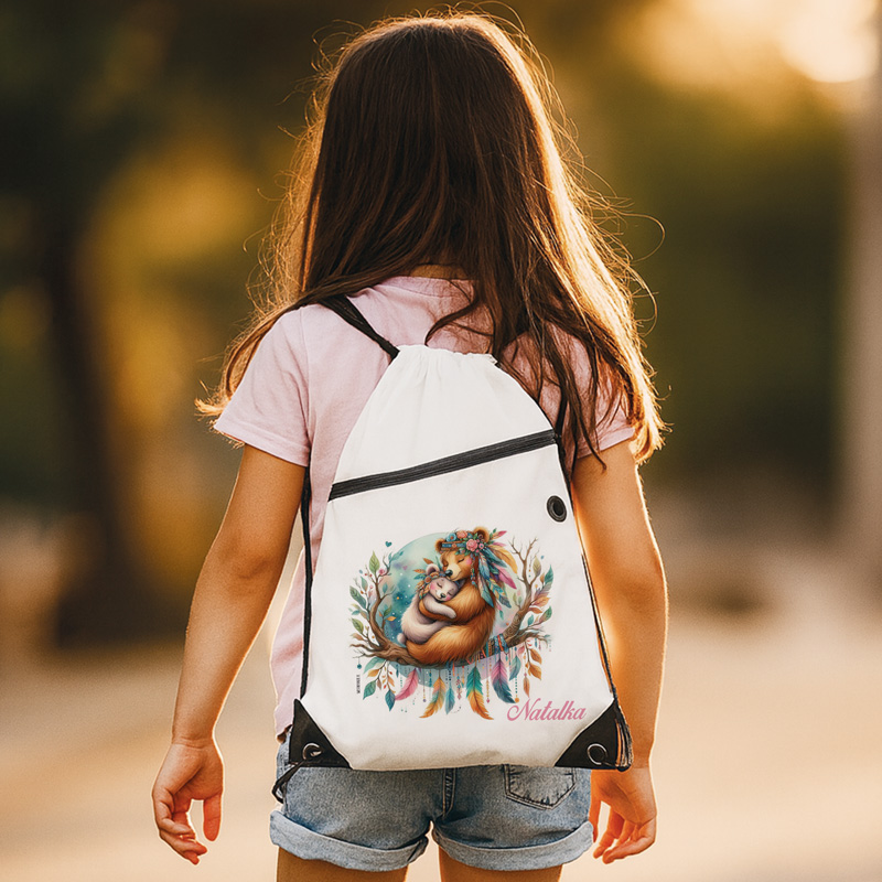 Plecak urzeka swoim magicznym nadrukiem. Widnieje na nim obrazek z dwoma słodkimi niedźwiadkami, które się przytulają. Mamy niedźwiedzica jest brązowa, a jej maleństwo szare. Misie ozdobione są w bajkowy sposób z kolorowymi piórkami i kwiatami. Siedzą na gałęzi, która jest udekorowana pełnymi barw pióropuszami. Wokół zwierząt rozpościera się piękny widok na księżyc. Personalizowany napis z imieniem dziewczynki dodaje unikalnego charakteru, sprawiając, że worek jest jedyny w swoim rodzaju. Całość wykonano z wysokiej jakości materiałów, co zapewnia trwałość i komfort użytkowania. Dodatkowym atutem jest funkcjonalna kieszonka zapinana na suwak, gdzie znajdzie się miejsce na drobne przedmioty dziewczynki. Regulowane sznurki pozwalają na wygodne noszenie plecaka. Otwór na słuchawki daje możliwość słuchania ulubionej muzyki w każdej sytuacji.