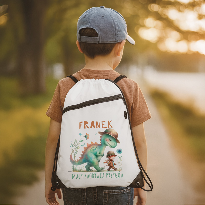 Praktyczny worek na wycieczkę wykonany jest z wysokiej jakości, wytrzymałego materiału, który łatwo utrzymać w czystości, co czyni go idealnym na codzienne przygody młodych eksploratorów. Na jego jasnym tle znajduje się kolorowa grafika przedstawiająca bajkowego dinozaura w kapeluszu, który jest towarzyszem małego chłopca, również ubranego w kapelusz, na tle prehistorycznych roślin i motyli. Obraz dodaje charakteru workowi na wycieczkę, tworząc wesołą i przyjazną atmosferę. Tekst: [imię] – Mały zdobywca przygód personalizuje worek, dodając mu unikalnego charakteru i czyniąc go wyjątkowym dla każdego dziecka. Worek jest wyposażony w wytrzymałe sznurki do noszenia na plecach, co gwarantuje komfort nawet podczas długotrwałego użytkowania, oraz w dodatkową kieszonkę na zamek, idealną na drobne przedmioty, takie jak klucze, telefon czy małe zabawki.