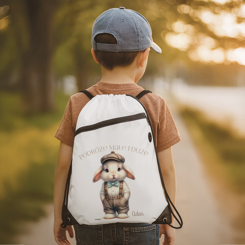 Potrzebujesz funkcjonalnego i estetycznego gadżetu, który sprawdzi się w codziennych przygodach Twojego dziecka? Personalizowany worek z imieniem i grafiką eleganckiego zajączka to idealny wybór. Praktyczny dodatek będzie niezastąpiony w przedszkolu, na wycieczkach czy podczas zajęć sportowych. Personalizacja sprawia, że każde dziecko poczuje się wyjątkowe, mając produkt zaprojektowany specjalnie dla siebie. Worek z imieniem dziecka został wykonany z wysokiej jakości, trwałego materiału, który jest odporny na zabrudzenia i łatwy do utrzymania w czystości. Na białej powierzchni widnieje starannie wykonana grafika przedstawiająca uroczego zajączka w kaszkiecie, muszce i szelkach. Taki design nadaje całości eleganckiego i unikalnego charakteru. Nad zajączkiem znajduje się napis „Podróże małe i duże”, który nawiązuje do praktycznego zastosowania worka, a na dole widnieje personalizowane imię dziecka, np. „Krzyś”. Dzięki temu produkt nabiera osobistego charakteru i z pewnością stanie się ulubionym gadżetem malucha. Produkt jest wyposażony w solidne, czarne sznurki, które umożliwiają wygodne noszenie na plecach lub w ręku. Wzmocnione rogi dodatkowo zwiększają wytrzymałość, dzięki czemu worek poradzi sobie nawet z intensywnym użytkowaniem. Jego uniwersalny design sprawia, że pasuje zarówno dla chłopców, jak i dziewczynek.