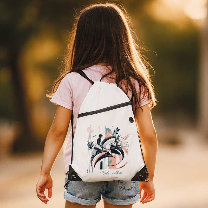Prezent dla miłośniczki jazdy konnej musi być wyjątkowy i praktyczny. Worek treningowy dla miłośnika koni to niezbędny element wyposażenia dla każdego pasjonata tej pięknej dziedziny. Jego praktyczny design i wygodne ramiączka pozwalają na wygodne przechowywanie najważniejszych rzeczy podczas treningów lub wycieczek konnych. Prostokątny kształt worka ułatwia pakowanie, a zaciągane ramiączka zapewniają bezpieczne zamknięcie i łatwe przenoszenie. Worek został wykonany w kolorystyce nawiązującej do elegancji i siły koni, co sprawia, że jest nie tylko praktycznym, ale także stylowym dodatkiem dla każdego miłośnika tych zwierząt. Na jego powierzchni znajduje się piękny nadruk przedstawiający nowoczesną grafikę konia i jockeya na tle pastelowych geometrycznych kształtów. Aby jeszcze bardziej spersonalizować ten wyjątkowy worek, pod ilustracją umieścimy imię osoby, dla której ma być prezent. Dzięki temu każdy miłośnik koni będzie mógł mieć swój własny, indywidualny plecak, który będzie idealnym towarzyszem podczas treningów, zawodów czy spacerów w terenie.