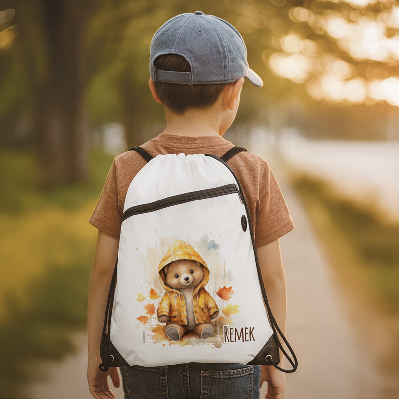 Personalizowany plecak do przedszkola został stworzony z myślą o najmłodszych użytkownikach, dbając o każdy szczegół, który mógłby wpłynąć na ich komfort. Wykonany z wysokiej jakości materiału, gwarantuje trwałość i odporność na zmienne warunki atmosferyczne. Grafika na worku przedstawia uśmiechniętego misia ubranego w żółty deszczowy płaszcz. Otacza go jesienny krajobraz – złote liście oraz krople deszczu. Worek zdobi imię dziecka, wykonane stylową, czytelną czcionką, która idealnie komponuje się z całością designu. Plecak do przedszkola posiada funkcjonalną kieszonkę zewnętrzną na zamek, która pomieści najważniejsze drobiazgi. Posiada także regulowane sznurki, które umożliwiają dopasowanie go do wzrostu dziecka, oraz przelotkę na słuchawki.