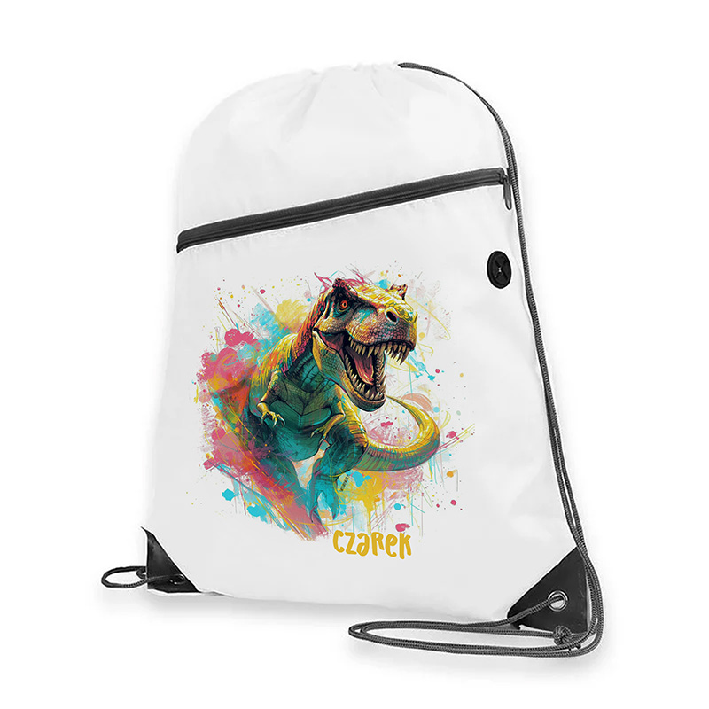 Na przedniej części worka znajduje się  ilustracja dinozaura w nowoczesnym, kolorowym stylu. Pod ilustracją umieszczone jest imię dziecka, które nadaje plecakowi indywidualnego charakteru. Plecak wykonany jest w formie wygodnego worka, który można nosić na plecach dzięki wytrzymałym sznurkom. Dzięki temu jest lekki, komfortowy i bardzo praktyczny w codziennym użytkowaniu. Doskonale sprawdzi się jako worek na zajęcia sportowe, wycieczki, treningi czy spacer. Dodatkowym atutem jest dodatkowa, przednia kieszeń zapinana na zamek, która pozwala bezpiecznie przechowywać drobne przedmioty. Worek posiada również praktyczną przelotkę na słuchawki lub kabel powerbanka, który można schować do worka.