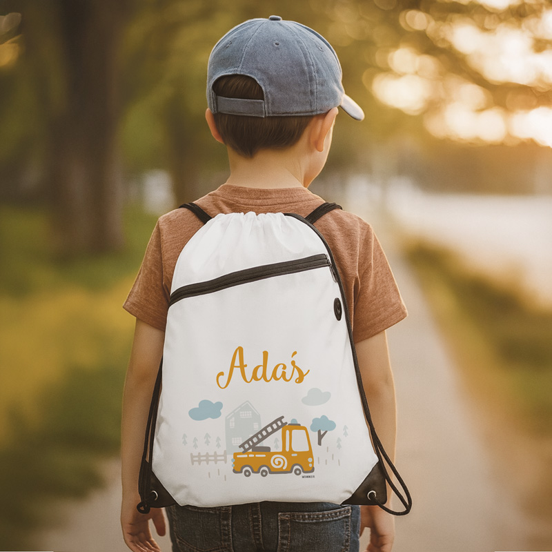 Worek plecak o czarno-białej kolorystyce, ozdobiony jest kolorowym nadrukiem wozu strażackiego, domku, drzew i chmur. Nadruk z imieniem dziecka w ciepłym, słonecznym kolorze od razu przykuwa uwagę. Plecak wykonano z trwałego materiału, wytrzymałego na dziecięce szaleństwa. Worek wykończony jest solidnymi, czarnymi sznurkami, które zapewniają wygodę noszenia oraz łatwość otwierania i zamykania. Praktyczna, zewnętrzna kieszeń na zamek pozwala na przechowywanie najpotrzebniejszych rzeczy. To doskonały wybór na prezent, który sprawdzi się zarówno na co dzień, jak i od święta.