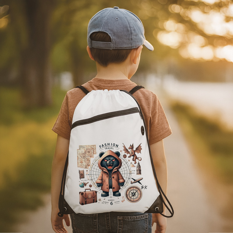 Sportowy worek z oryginalnym nadrukiem to idealny prezent dla nastolatka, który łączy modny styl z praktycznym zastosowaniem. Jego wymiary – 34,5 × 45 cm – czynią go wygodnym i pojemnym dodatkiem na co dzień. Doskonale sprawdzi się jako worek na buty, strój sportowy lub niezbędne drobiazgi do szkoły, na trening czy w podróży. Nowoczesny design z motywem niedźwiedzia w kurtce oraz dodatkowymi grafikami – smokiem, samolotem, walizką i kompasem – trafia w gust młodzieży, która ceni indywidualizm i oryginalność. Dodatkowo personalizacja inicjałami sprawia, że worek zyskuje osobisty charakter.