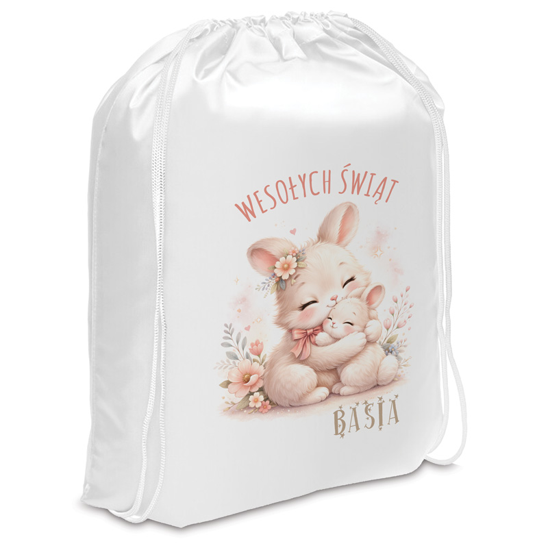 Biały worek z rysunkiem dwóch uroczych króliczków, obok napisu "Wesołych Świąt" i imienia "BASIA".