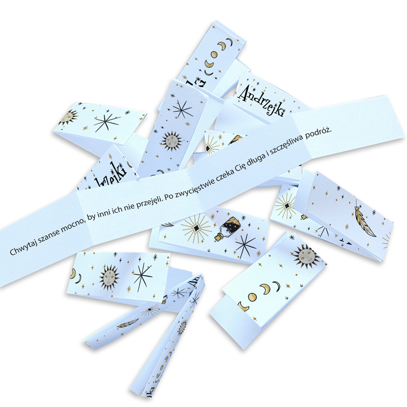 Atrakcja na imprezę andrzejkową w postaci karteczek z wróżbami to absolutny must have! Każda wróżba wprowadzi klimat tajemnicy i rozbudzi ciekawość uczestników imprezy. Pakiet XXL zawiera 112 karteczek z wróżbami.