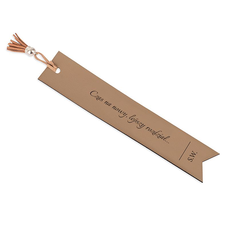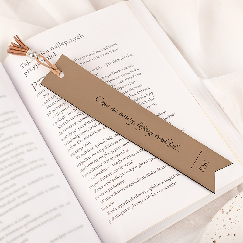 Personalizowana zakładka prezent na rozwód została wykonana z wysokiej jakości naturalnej skóry. Zakładka jest smukła, lekka i przyjemna w dotyku, dzięki czemu świetnie układa się między kartkami. Jej subtelny, beżowy kolor idealnie komponuje się z różnymi okładkami książek. Na górnym końcu znajduje się niewielki otwór z przewleczonym skórzanym rzemykiem. Dodatkowo rzemyk ozdabia srebrny koralik, który podkreśla jej elegancki charakter. Na powierzchni zakładki wygrawerowano pięknym stylem napis: „Czas na nowy, lepszy rozdział…”. Jest to delikatny, lecz czytelny komunikat o rozpoczęciu czegoś pozytywnego. Pod cytatem jest miejsce na personalizację, czyli inicjały obdarowanej osoby – np. „S.W.”. Taka skórzana zakładka do książki z personalizacją staje się w ten sposób prezentem osobistym i symbolicznym jednocześnie.