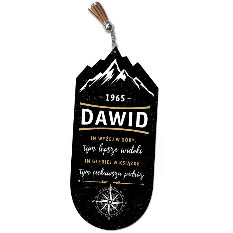 Zakładka wykonana jest z trwałego materiału, dzięki czemu długo zachowuje kształt i kolor. Jej wyjątkowy kształt nawiązuje do górskich szczytów, natomiast czarne tło z subtelnymi akcentami złota nadaje całości elegancji. Na górze znajduje się grafika przedstawiająca ośnieżone szczyty, a poniżej umieszczono personalizowane imię oraz rok, który możesz wybrać samodzielnie. Dzięki temu personalizowana zakładka do książki dla miłośnika gór nabiera indywidualnego charakteru i staje się wyjątkowym dodatkiem do każdej lektury. Ponadto na zakładce widnieje inspirujący cytat o wędrówce i książkach, który idealnie pasuje do klimatu produktu. Na dole umieszczony jest motyw kompasu, co dodatkowo podkreśla podróżniczy charakter zakładki. Delikatny łańcuszek zakończony brązowym chwostem dodaje całości lekkości i elegancji, a jednocześnie sprawia, że zakładka wygląda pięknie, wystając z książki. Dzięki temu każdy miłośnik gór odnajdzie w niej coś, co łączy jego pasję do natury i literatury.