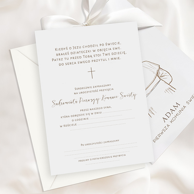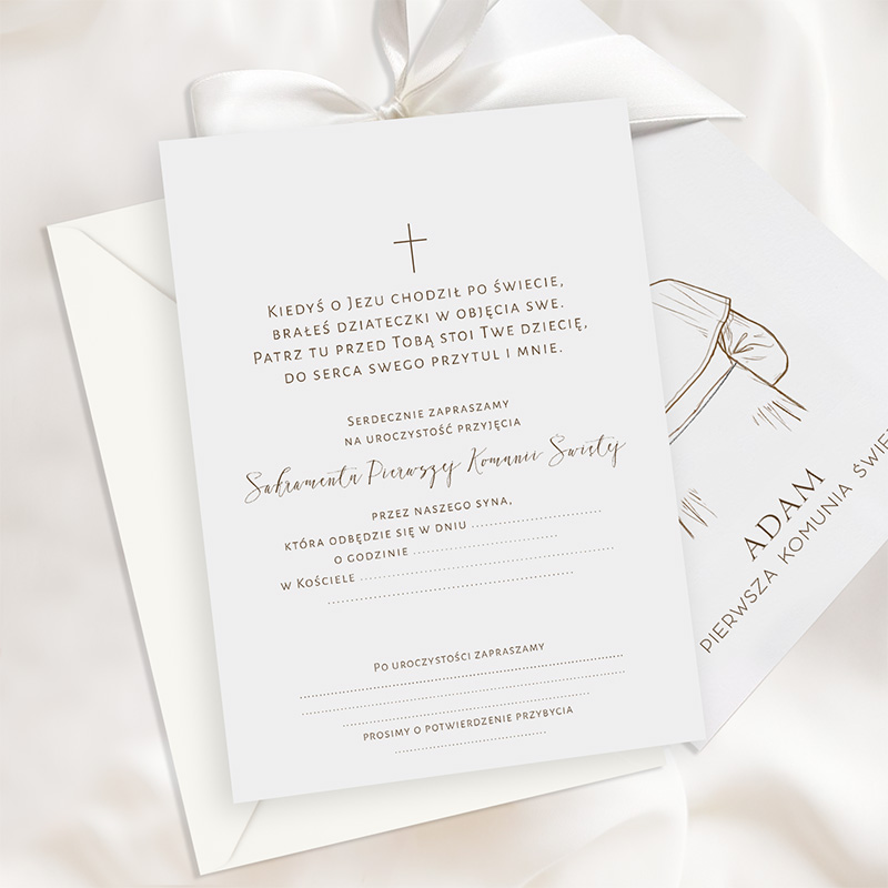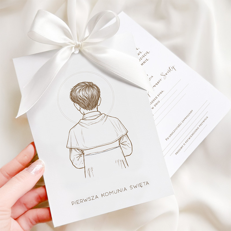 Każde zaproszenie tworzy dekoracyjna okładka oraz karta przeznaczona do wpisania danych. Dołączona wstążka pozwala samodzielnie przewiązać całość, nadając zaproszeniu odświętny wygląd, a koperty umożliwiają szybkie przygotowanie ich do wręczenia. Okładkę zdobi delikatna grafika chłopca w stroju komunijnym oraz napis informujący o okazji, natomiast w środku znajduje się gotowy tekst z miejscem na najważniejsze szczegóły uroczystości.