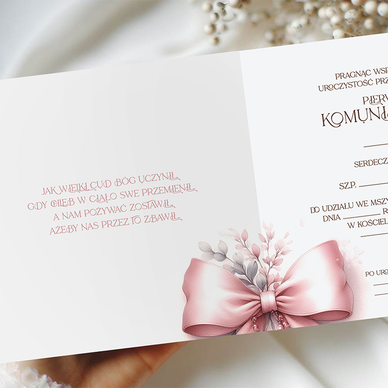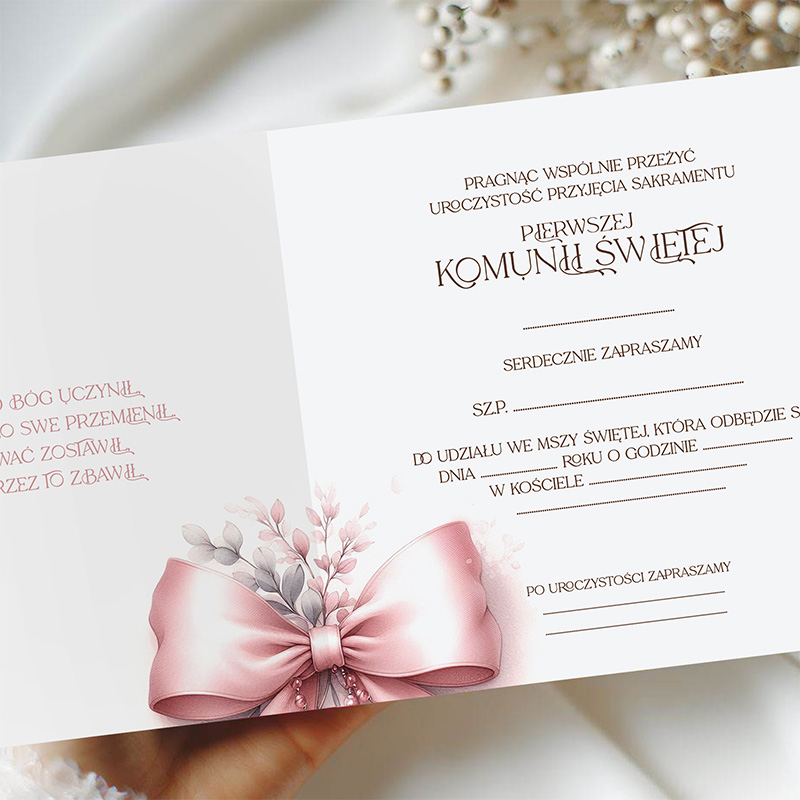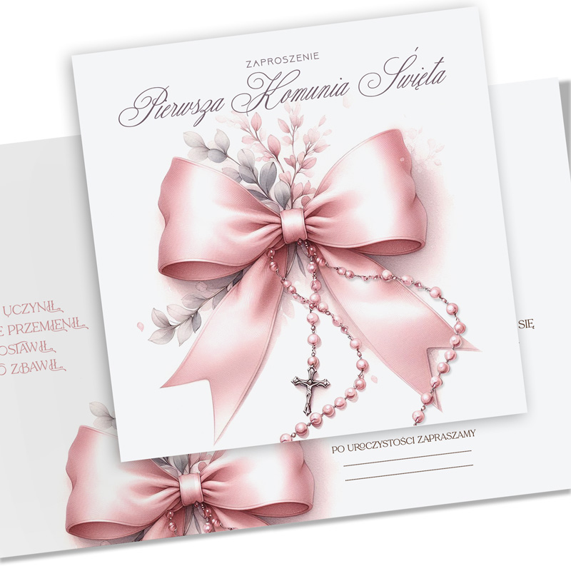 Pierwsza Komunia Święta to jeden z najważniejszych dni w życiu dziecka, dlatego warto nadać mu wyjątkową oprawę już na etapie zapraszania gości. Zaproszenia z delikatnym motywem różowej kokardy pięknie podkreślają uroczysty charakter wydarzenia i świetnie wpisują się w komunijną estetykę – subtelną, jasną i elegancką.