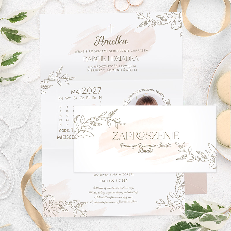 Zaproszenie utrzymane jest w jasnej kolorystyce beżu i bieli. Subtelne motywy roślinne oraz minimalistyczny krzyżyk podkreślają duchowy charakter uroczystości. Na froncie znajduje się imię dziecka. W środku składanego zaproszenia centralnym elementem jest zdjęcie dziecka umieszczone w dekoracyjnym, roślinnym wianku. Personalizacja obejmuje imię, fotografię oraz wszystkie niezbędne informacje. Tekst zaproszenia jest w pełni personalizowany, dlatego każde zaproszenie jest gotowe do wręczenia i nie wymaga ręcznego wypełniania. Projekt obejmuje również kalendarz z zaznaczoną datą Komunii, dzięki czemu goście z łatwością zapamiętają termin uroczystości.
