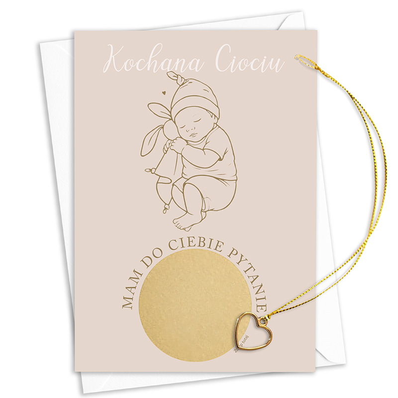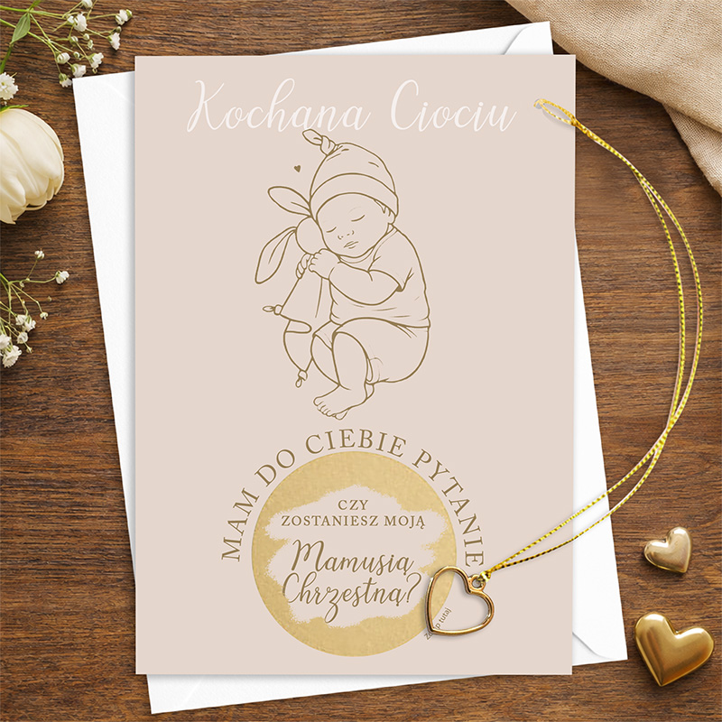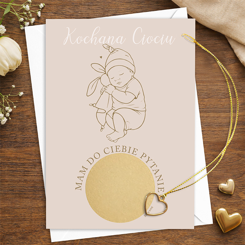 Przedstawia ona obrazek małego chłopca drzemiącego, tulącego swoją ulubioną przytulankę. Na górze karty, elegancko zapisany, znajduje się serdeczny zwrot “Kochana Ciociu”. Wykorzystana czcionka przypomina ręczne pismo. Nad złotym, okrągłym polem, które można zdrapać, widać napis “Mam do Ciebie pytanie”, który zapowiada niespodziankę kryjącą się pod złotkiem. Po zdrapaniu ujawnia się ukryte pytanie “Czy zostaniesz moją Mamą Chrzestną?”, które z pewnością wywoła wzruszenie i uśmiech na twarzy. Przy zdrapce dołączona jest zawieszka do zdrapywania. Wszystko zostanie elegancko zapakowane w kopercie.