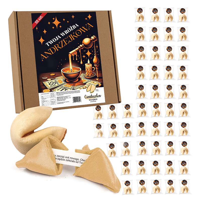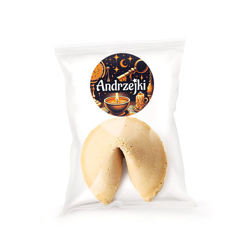 Zaskocz gości i uczestników imprezy wyjątkowym akcentem – zestawem ciasteczek z wróżbą na Andrzejki (50 szt.). Każde ciasteczko to nie tylko słodki dodatek, ale też andrzejkowa wróżba zapakowana w ozdobną etykietę. Świetny wybór na firmowe wydarzenia, szkolne zabawy i tematyczne wieczory wróżb.