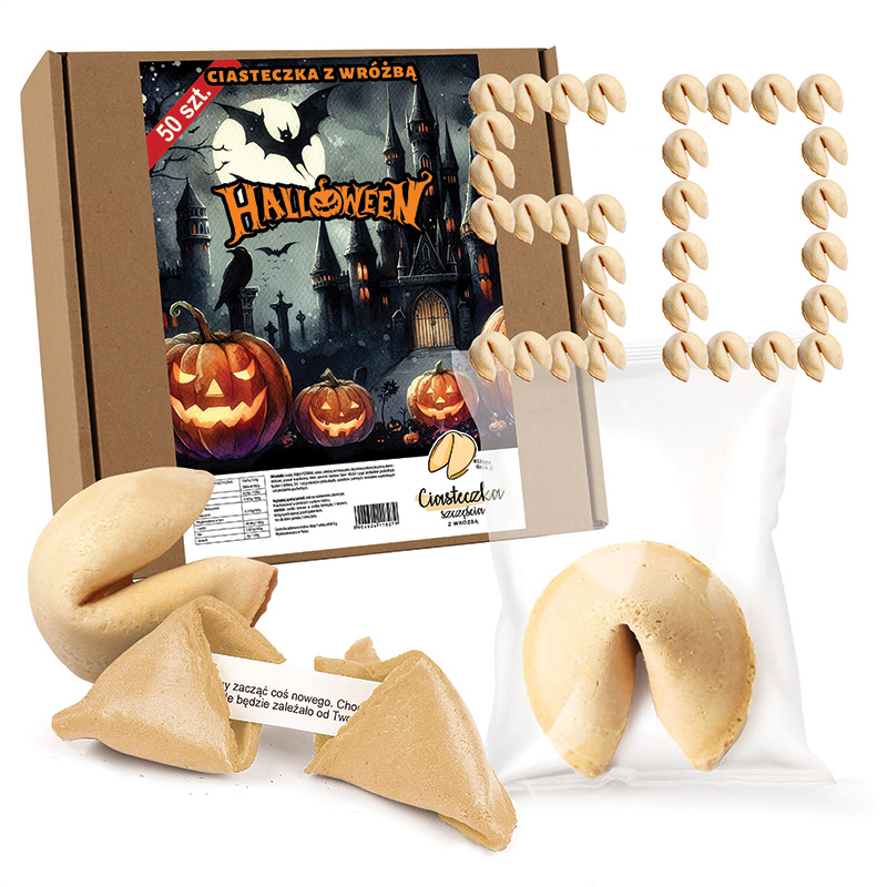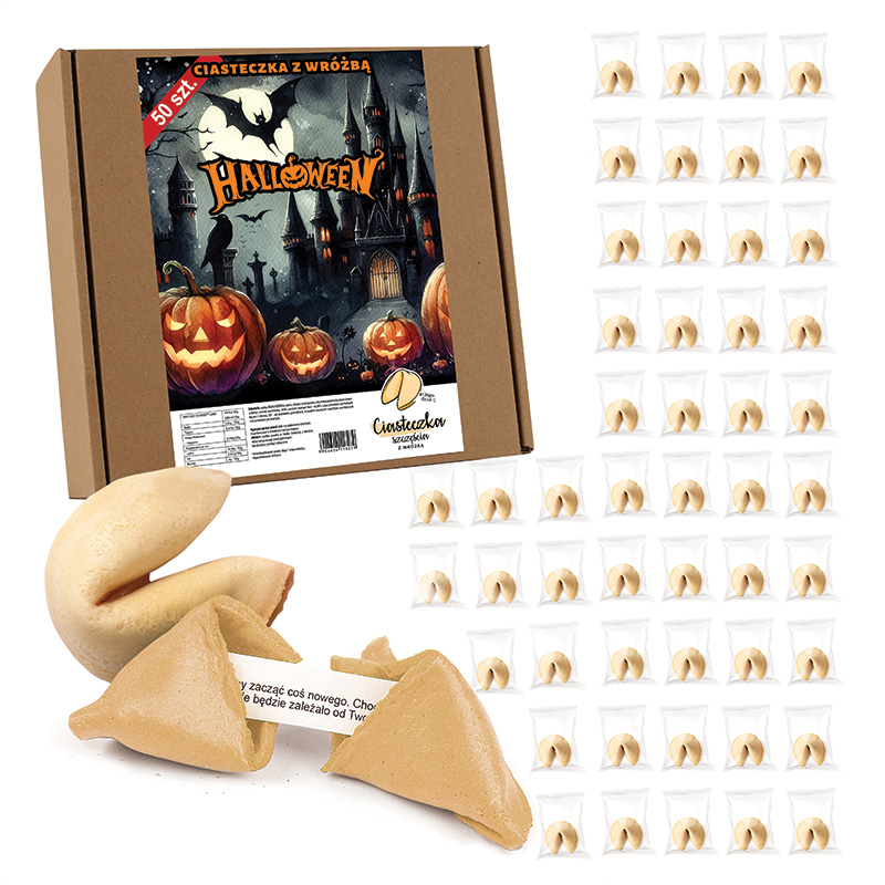 W zestawie znajduje się 50 sztuk chrupiących ciasteczek z wróżbą, które kryją w środku zabawne sentencje i pozytywne przesłania. Każde ciasteczko zostało osobno zapakowane w przezroczystą folię. Ciasteczka wypiekane są w Polsce z najwyższej jakości składników, dzięki czemu są pyszne i chrupiące. To świetna atrakcja, która urozmaici każde przyjęcie halloweenowe — zarówno dla dzieci, jak i dorosłych. Na froncie kartonika została umieszczona grafika upiornego zamku, dynie z wyciętymi twarzami oraz klimatyczne tło z nietoperzami i księżycem.