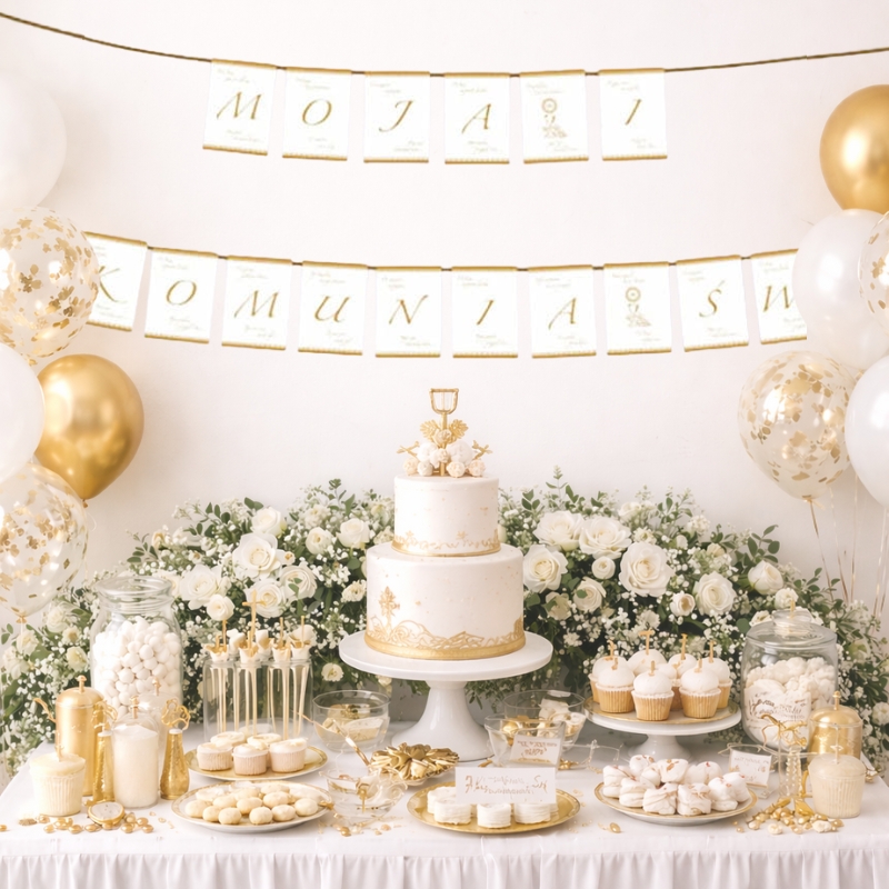 Zestaw dekoracji komunijnych sprawdzi się idealnie zarówno w domu, jak i w restauracji czy sali bankietowej. Jego uniwersalna kolorystyka pasuje zarówno do przyjęcia dla dziewczynki, jak i chłopca. Dzięki temu bez trudu dopasujesz go do innych dodatków, takich jak kwiaty, zastawa czy świeczki. Ponadto komplet pozwala szybko i wygodnie przygotować elegancką aranżację bez konieczności dobierania elementów osobno, dlatego oszczędzasz czas i masz pewność spójnego efektu. Zestaw dekoracji komunijnych złota koronka IHS to elegancka i stylowa dekoracja na Pierwszą Komunię Świętą.