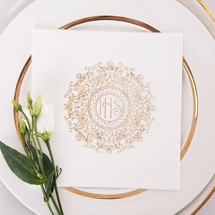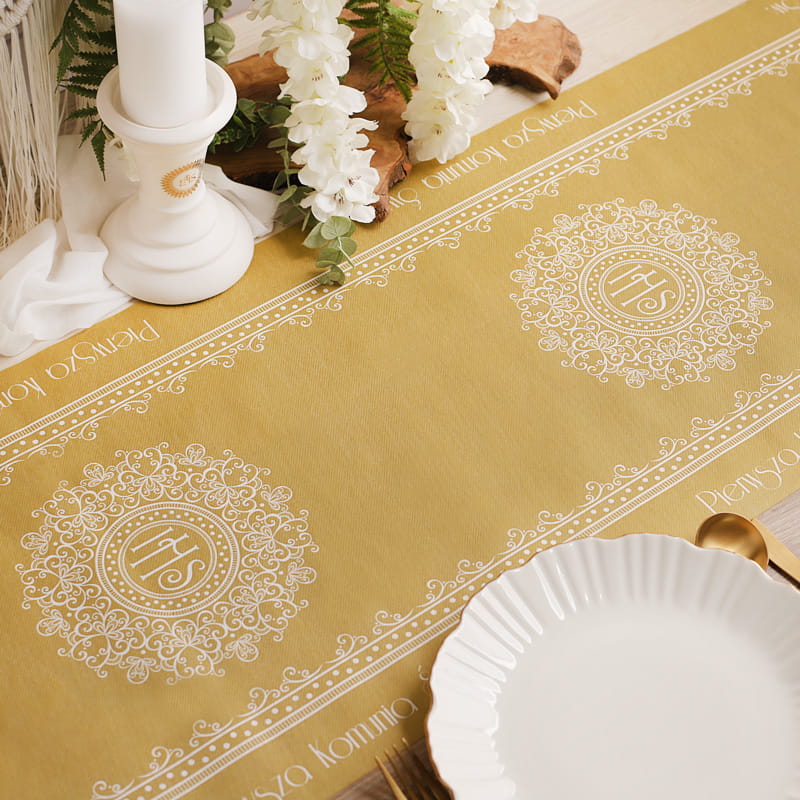 Zestaw zawiera bieżnik, serwetki oraz baner. Bieżnik wyróżnia się złotym wzorem inspirowanym koronką oraz eleganckim wykończeniem po bokach. Serwetki utrzymane są w tej samej stylistyce, dlatego tworzą harmonijną całość z bieżnikiem. Na każdej serwetce widoczny jest delikatny złoty ornament oraz symbol IHS. Dodatkowo w zestawie znajduje się baner z napisem „Moja I Komunia Św”, który składa się z eleganckich kart z subtelnym złotym zdobieniem. Dodatkowo na każdej literze napisu znajduje się również fragment tekstu religijnej pieśni.