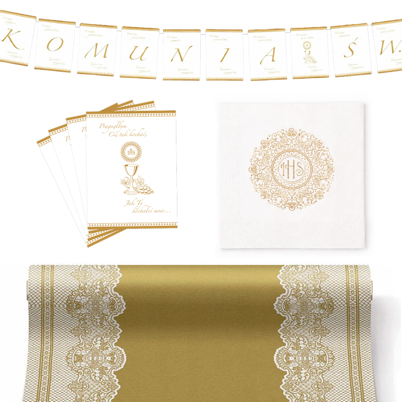 Zestaw dekoracji komunijnych złota koronka IHS zawiera bieżnik, serwetki i baner. Elegancka oprawa stołu na Pierwszą Komunię Świętą w klasycznym złotym stylu to idealny wybór do domu lub restauracji, który podkreśla wyjątkowy charakter uroczystości i tworzy spójną aranżację przyjęcia komunijnego dla dziecka.