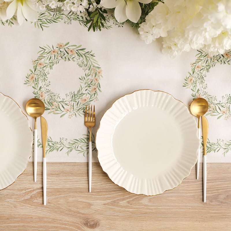 Bieżnik zdobią lekkie, roślinne wzory w odcieniach zieleni, które pięknie komponują się z białą zastawą i naturalnymi dodatkami. To elegancka baza każdej aranżacji stołu podczas przyjęcia. Serwetki z napisem „Chrzest Święty” stanowią nie tylko praktyczny element, ale także dekoracyjny akcent podkreślający charakter uroczystości. Kieszonki na sztućce to funkcjonalne i estetyczne rozwiązanie, które dodaje elegancji nakryciu stołu oraz pomaga w organizacji zastawy dla gości. Zestaw świetnie sprawdzi się podczas przyjęcia w domu, restauracji lub sali bankietowej. Dzięki uniwersalnemu designowi wpisuje się w aktualne trendy dekoracyjne i pozwala szybko stworzyć wyjątkową atmosferę.