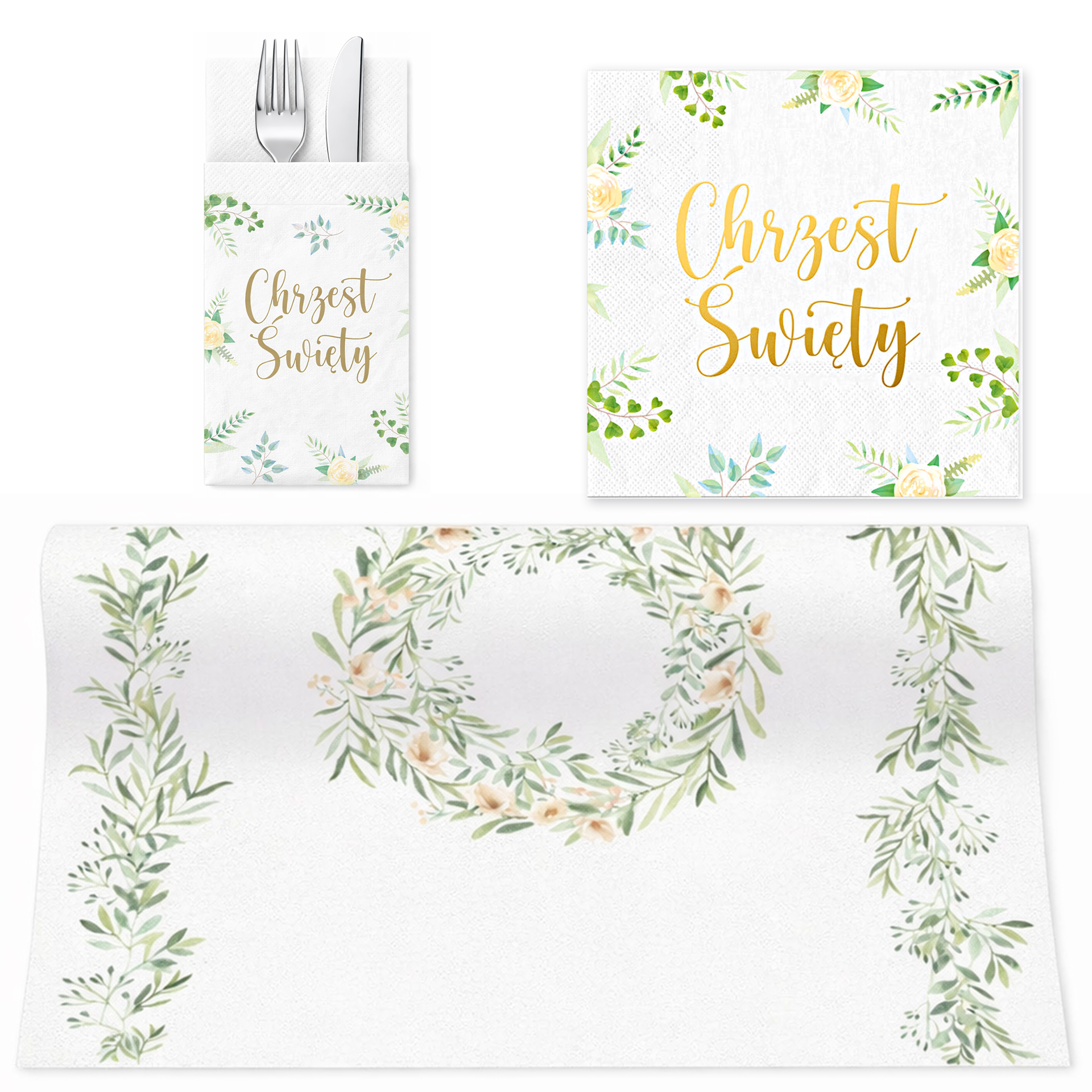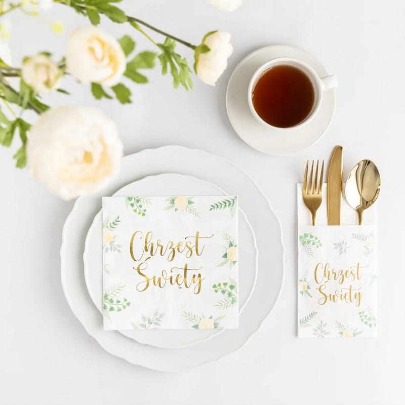 Zestaw dekoracji na Chrzest Święty to idealne rozwiązanie dla osób, które chcą przygotować elegancką i harmonijną oprawę przyjęcia. Motyw delikatnych liści i kwiatów w połączeniu ze złotymi napisami tworzy kompozycję pasującą zarówno dla chłopca, jak i dziewczynki. W skład zestawu wchodzi bieżnik na stół, serwetki oraz praktyczne kieszonki na sztućce. Wszystkie elementy zostały zaprojektowane w jednej stylistyce, dzięki czemu doskonale się uzupełniają i tworzą spójną dekorację stołu.