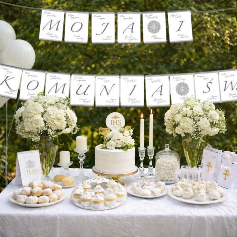 Zestaw dekoracji komunijnych sprawdzi się idealnie podczas organizacji przyjęcia w domu, restauracji lub sali. Co więcej, dzięki swojej uniwersalnej stylistyce pasuje zarówno do uroczystości dla dziewczynki, jak i chłopca. Zestaw ułatwia przygotowanie spójnej aranżacji bez konieczności dobierania dodatków osobno, dlatego oszczędzasz czas i masz pewność doskonałego efektu. Zestaw dekoracji na Komunię z bieżnikiem, serwetkami i banerem to elegancka i spójna dekoracja przyjęcia komunijnego.
