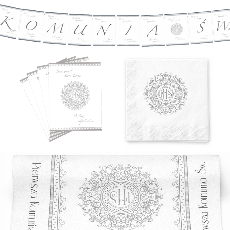 W skład zestawu wchodzi bieżnik, serwetki oraz baner. Bieżnik wyróżnia się eleganckim wzorem inspirowanym delikatną koronką oraz symbolem IHS umieszczonym w centralnej części. Ponadto jego jasna kolorystyka sprawia, że doskonale komponuje się z białą zastawą i dodatkami. Serwetki również zdobione są srebrnym ornamentem oraz symbolem eucharystycznym, dlatego tworzą spójną całość z bieżnikiem. Dodatkowo w zestawie znajduje się baner z napisem „Moja I Komunia Św”. Na każdej z nich widnieje pojedyncza litera, co pozwala stworzyć efektowną dekorację ściany lub przestrzeni nad stołem. Dodatkowo na każdej literze napisu znajduje się również fragment tekstu religijnej pieśni, co nadaje banerowi jeszcze większy głęboki charakter.