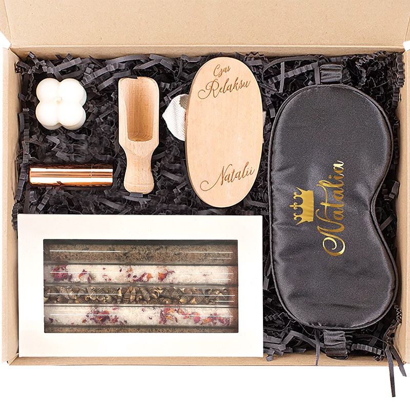 W środku zestawu znajduje się: satynowa czarna opaska na oczy ze złotym imieniem – idealny dodatek do relaksującej wieczornej rutyny pielęgnacyjnej. Szczotka do ciała z dedykacją – została stworzona z myślą o relaksującym masażu na sucho. W zestawie znalazły się także fiolki z dodatkami do relaksu takimi jak sole do kąpieli czy ozdobne elementy, które umilą każdą kąpiel. Nabierak do sali – ułatwia dodawanie soli do kąpieli. Świeczka sojowa mini bubble – pozwoli stworzyć spokojną atmosferę a pomadka ochronna do ust – zadba o skórę.