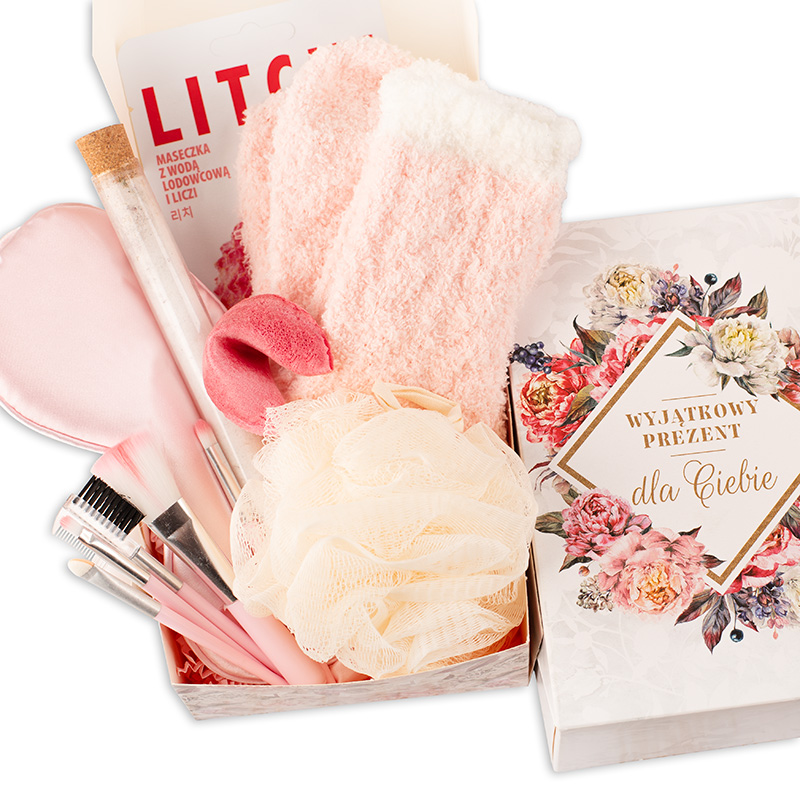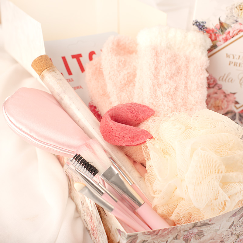 Zestaw zawiera wszystko, co potrzebne, by stworzyć w domowym zaciszu atmosferę jak z luksusowego spa. Miękka opaska na oczy pozwala się zrelaksować. Maseczka do twarzy zadba o nawilżenie i odświeżenie cery. W zestawie nie mogło zabraknąć grubych, różowych skarpetek, które otulają stopy i dodają uczucia komfortu, szczególnie w chłodniejsze dni. Dodatkową niespodzianką jest ciasteczko z wróżbą w różowym kolorze. W zestawie znalazła się również delikatna gąbka myjąca oraz komplet pędzli i szczoteczek do makijażu, w subtelnych odcieniach różu. Całość dopełnia fiolka z aromatyczną solą do kąpieli.