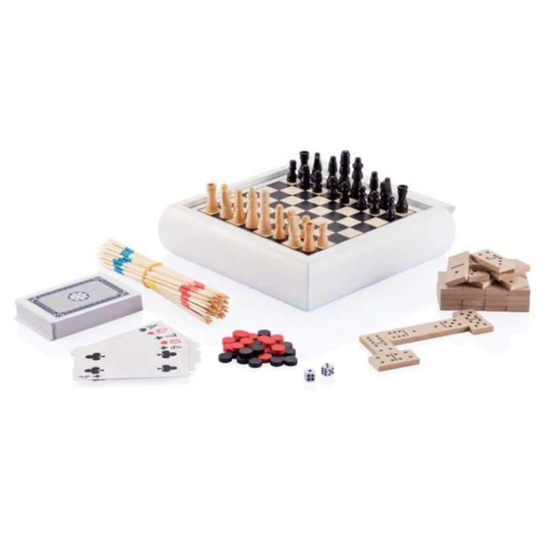- Zestaw gier 5 w 1 – w komplecie: mikado, karty do gry, domino, szachy, tryktrak