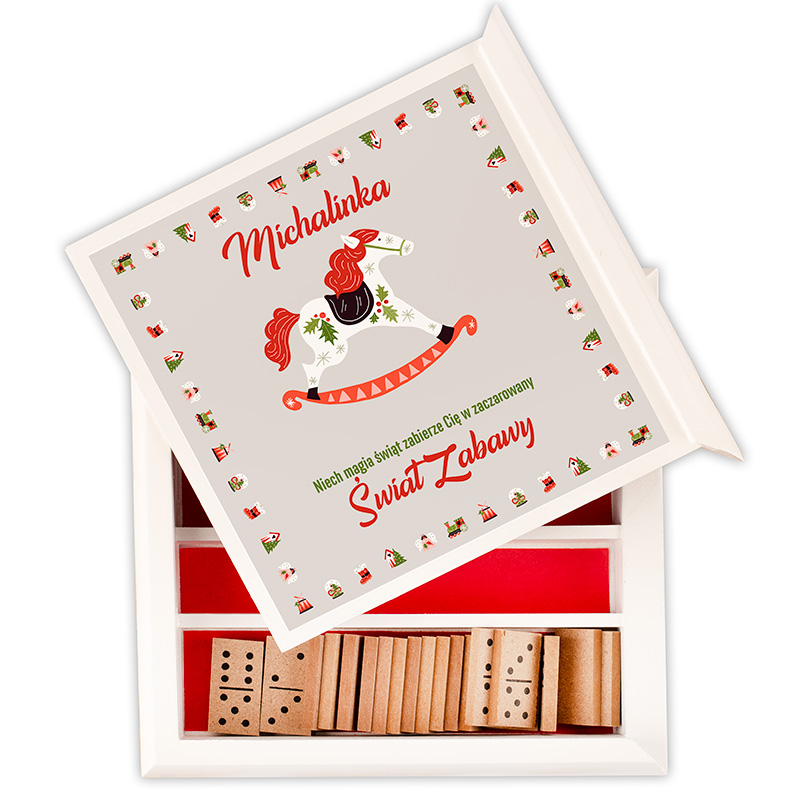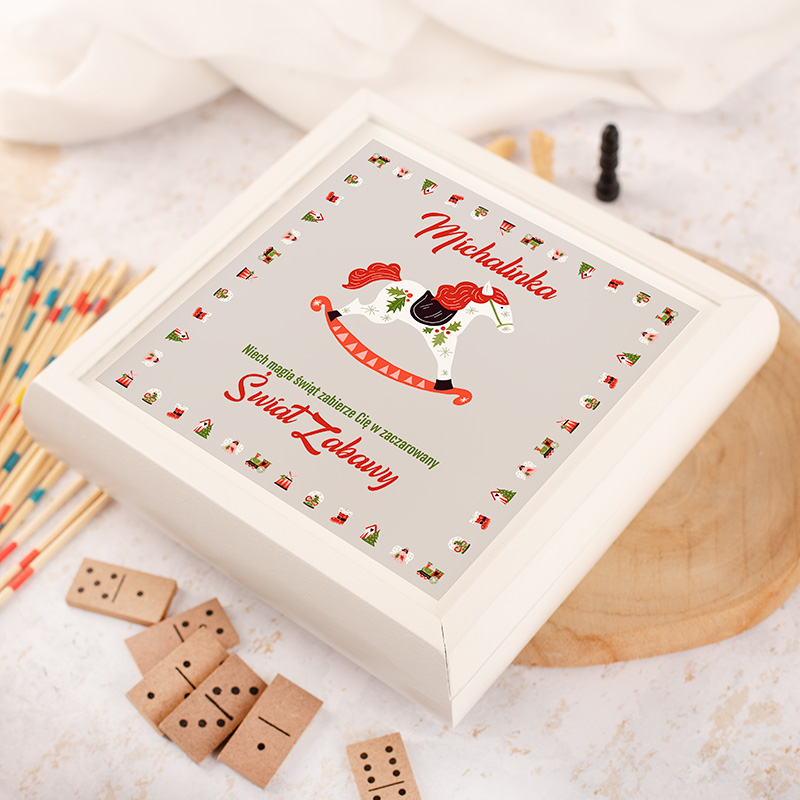 Na wieczku pudełka znajduje się świąteczna grafika z uroczym konikiem na biegunach oraz personalizowany napis z imieniem dziecka. Hasło: „Niech magia świąt zabierze Cię w zaczarowany Świat Zabawy” wprowadza magiczny klimat, idealnie wpisujący się w atmosferę Bożego Narodzenia. W środku znajduje się aż 5 klasycznych gier: mikado, domino, szachy, tryktrak oraz talia kart. To uniwersalny zestaw, który daje wiele możliwości zabawy – od szybkich rozgrywek z rodzeństwem, przez rodzinne popołudnia, aż po świąteczne wieczory z dziadkami. Gry wspierają rozwój intelektualny, koncentrację i uczą zdrowej rywalizacji. Są świetną alternatywą dla czasu spędzanego przed ekranem – pomagają budować relacje, uczą cierpliwości i rozwijają zdolności strategiczne.