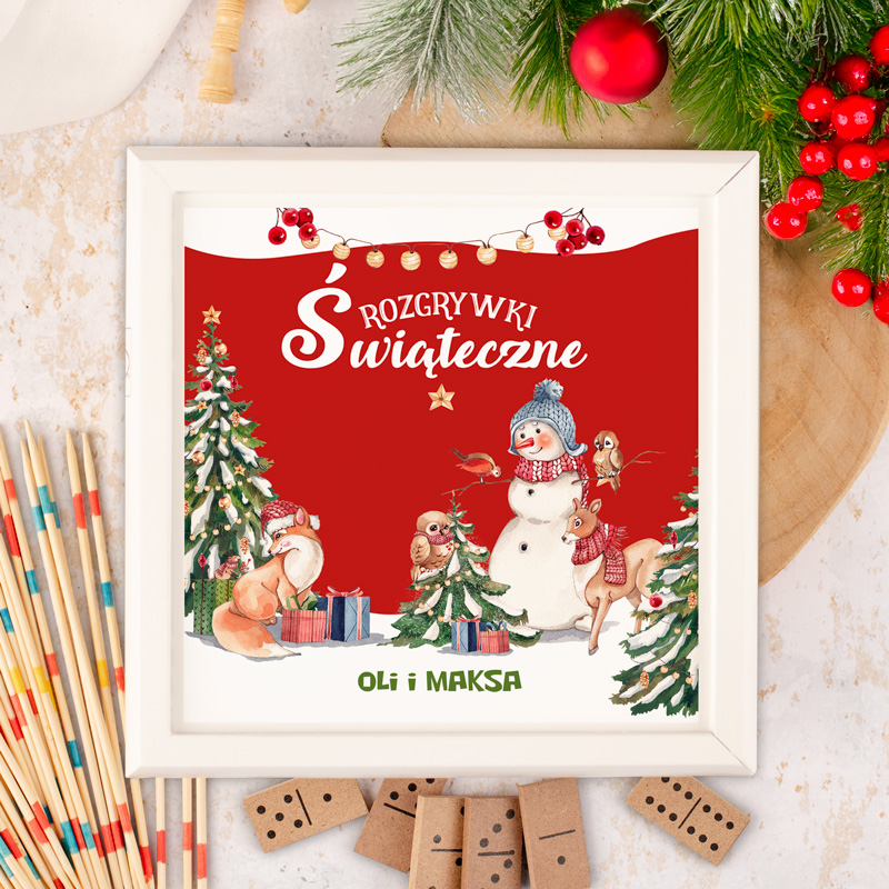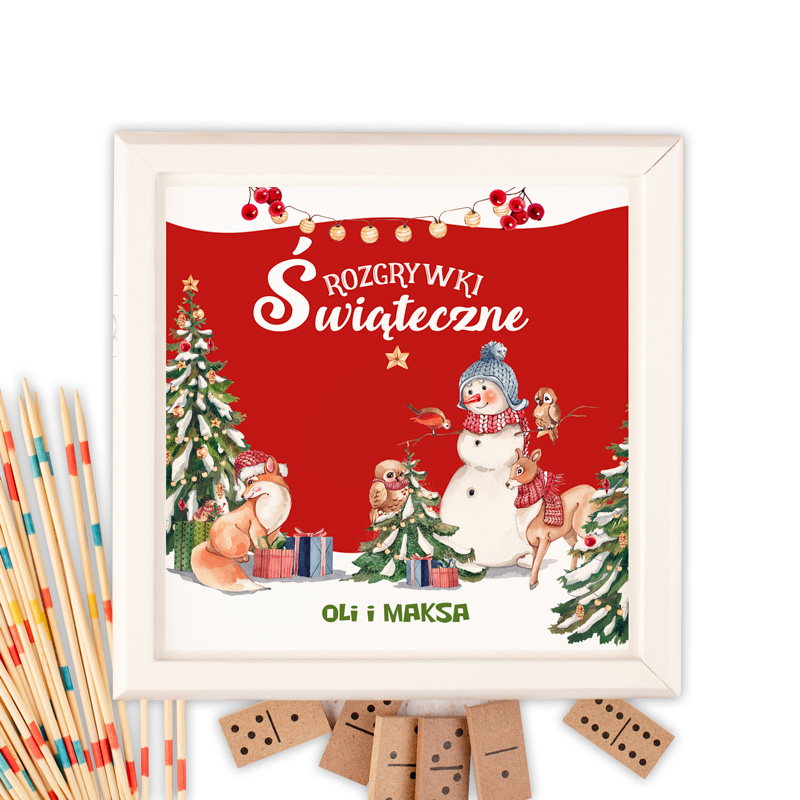 W drewnianym białym pudełku znalazło się 5 klasycznych gier: mikado, domino, karty do gry, szachy oraz tryktrak. Całość zapakowana jest w pudełko ozdobione grafiką ze świąteczną ilustracja z bałwankiem, postaciami zwierzątek oraz choinkami. Dodatkowo na froncie pojawia się personalizowany napis – mogą to być imiona dzieci lub członków rodziny.